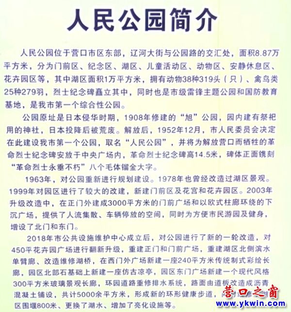 (營(yíng)口之窗“百姓說(shuō)事”)日前,營(yíng)口市人民公園新立了宣傳牌,向游客展示了該園的前世今生。牌上寫到:人民公園的原址是1908年日本侵華時(shí)期修建的旭園。當(dāng)時(shí),他們?cè)趫@內(nèi)建有祭祀用的神社,日本投降后,旭園荒廢。