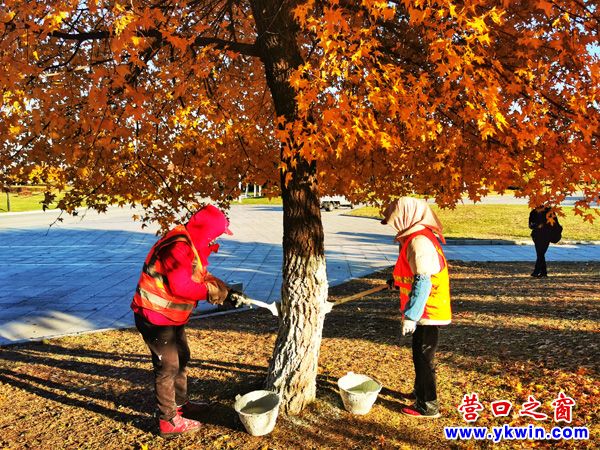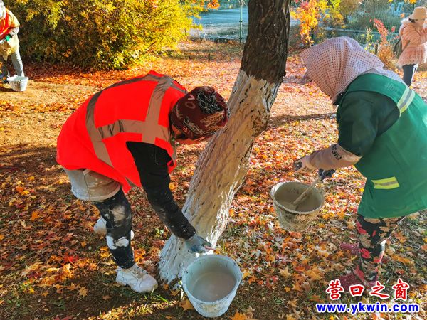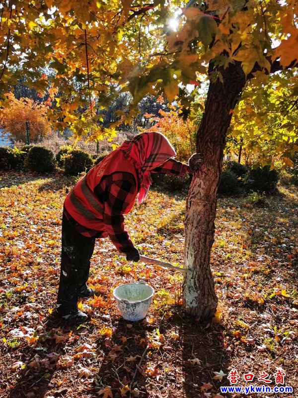 我被遠處的愉快笑聲所吸引,趕過去一問,原來是園林工人為樹過冬養(yǎng)護和消毒,樹干上白灰刷的整齊劃一!我被他們的勞動熱情感染!用手機拍下了他們工作的最美瞬間!