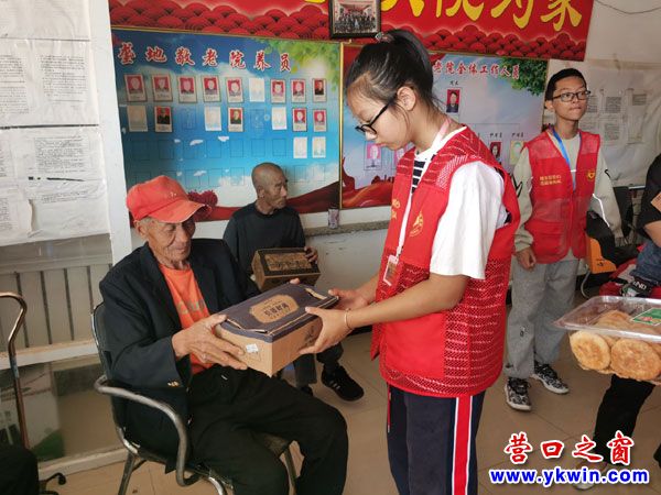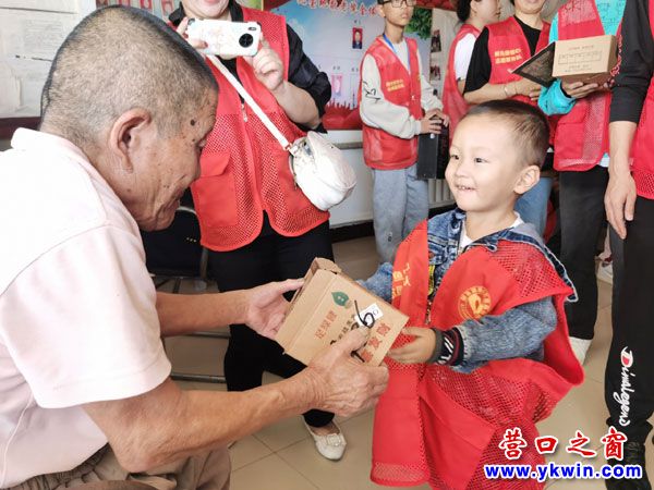 小志愿者給老人們分發(fā)水果和糕點(diǎn)。