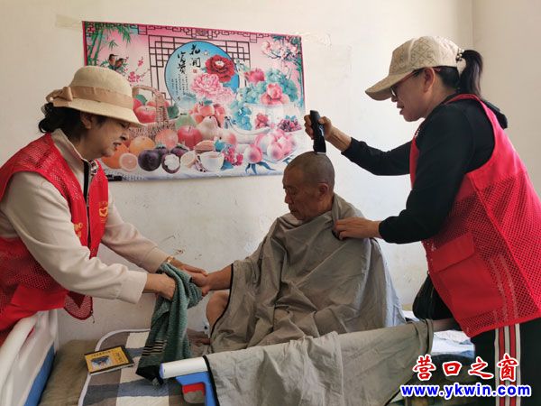 志愿者們?cè)诮o老人理發(fā)和整理衛(wèi)生。