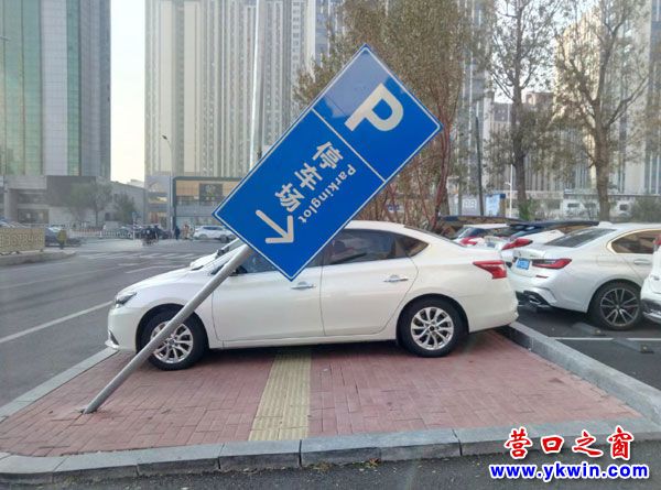 11月15日,穿過營口市惠賓路(中天市府廣場西),見到其南端的P(停車場)發(fā)生了傾斜,箭頭(→)誤指地下,而停車場在地面。