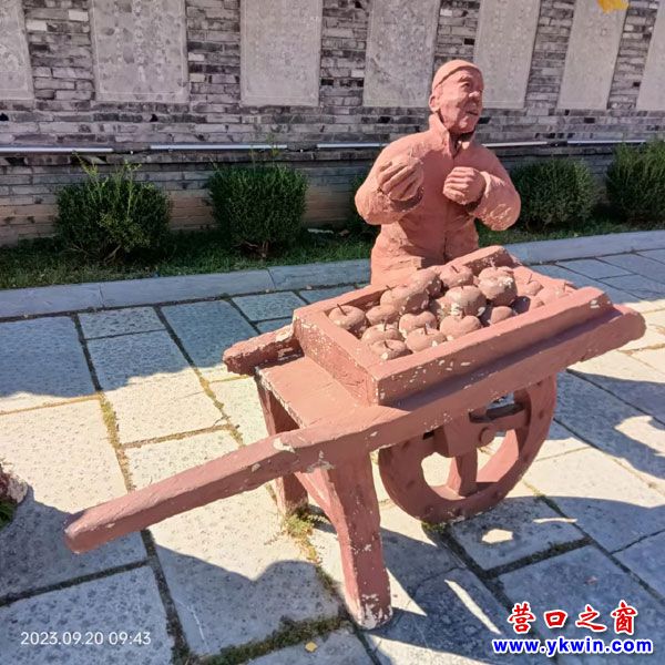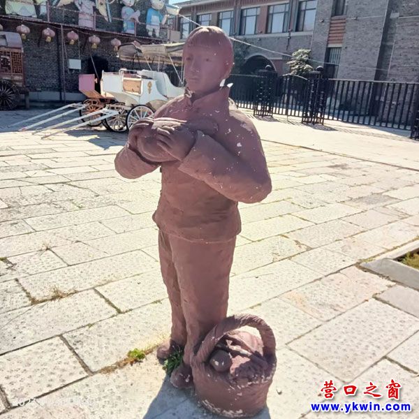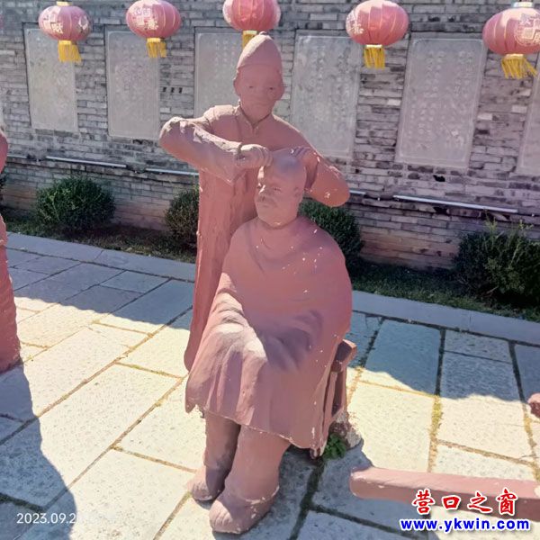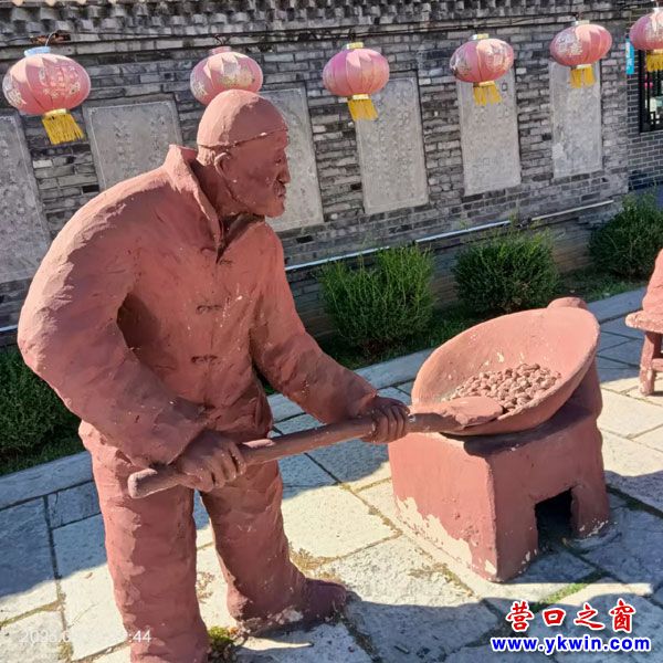 從營口市遼河老街東門進入,西行200多米,有一座青磚砌筑的詩詞碑 ,在這座碑的前面,東西排列著真人大小的人物雕塑九座。其中表現(xiàn)商販(賣菜、賣水果)的2座,在老街現(xiàn)場制作現(xiàn)場售賣食品的攤販(缸爐火勺、糖炒栗子、烤地瓜)的3座,從事服務(wù)行業(yè)的(喇叭匠、剃頭匠、磨刀匠)的3座,街頭的食客雕塑1座。從他們的服裝來看,大約是在舊時代冬春之際。這些雕像的表情和動作各有不同,但是栩栩如生,吸引了不少的游客在這里拍照留念。筆者從中也不禁聯(lián)想營口老街當年的商貿(mào)興隆的繁榮景象,佩服這些雕塑的設(shè)計者們,把社會底層的勞動人民的形象立于百年老港的街頭使游客領(lǐng)略歷史的滄桑。如今,雕塑里面的有些行當依然存在,卻是今非昔比了。經(jīng)營的產(chǎn)品和方式有了巨大的改變,舊時被稱為下九流的服務(wù)行業(yè)現(xiàn)在受到人們的尊重。從過去的剃頭匠到現(xiàn)在的美發(fā)師造型師,從過去的商販的延街叫賣到現(xiàn)在的專業(yè)店連鎖店,從過去的口口相傳到現(xiàn)在的網(wǎng)絡(luò)推銷代貨,表明時代發(fā)展是何等迅速。曾經(jīng)司空見慣的這些雕塑和同一條街上的上百個商鋪商亭的強烈反差使游人好像看到了一幅宏大的民生畫卷,筆者無論怎樣試圖用詩詞加以描述,也總是感到力不從心。