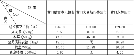 本期采訪營口三家超市部分商品價格比較表: