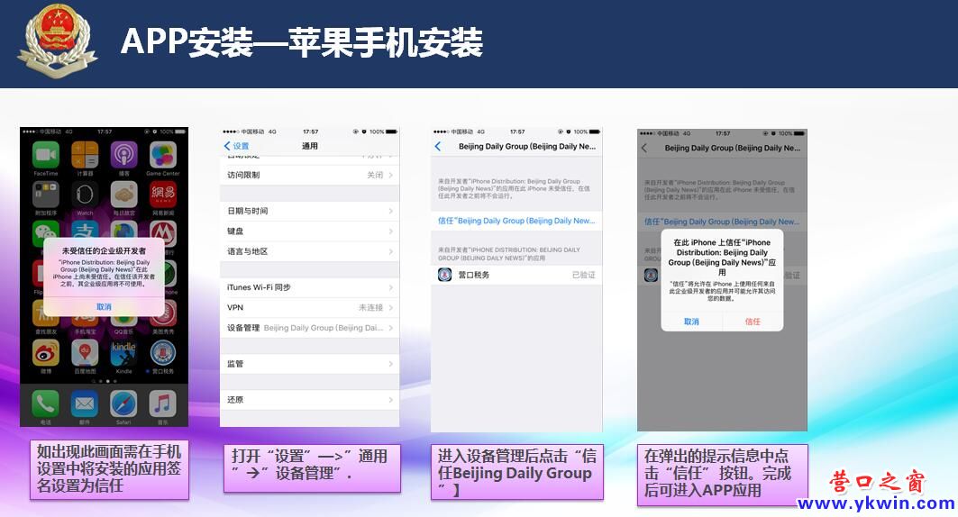http://42.202.133.28:8080/ykdsweb/ykds.htm,打開二維碼掃描頁掃描二維碼, 或微信掃一掃直接掃描二維碼也可進(jìn)入APP下載頁面,然后按照相應(yīng)的操作指示下載安裝即可。使用蘋果手機(jī)的納稅人需要到手機(jī)設(shè)置中將安裝的應(yīng)用簽名設(shè)置為信任,即打開設(shè)置,進(jìn)入設(shè)備管理后點(diǎn)擊“信任Beijing Daily Group ”即可完成安裝。納稅人首次安裝“手機(jī)移動稅務(wù)平臺”后,需要進(jìn)行身份驗(yàn)證,以便于以后稅務(wù)機(jī)關(guān)點(diǎn)對點(diǎn)的進(jìn)行涉稅信息及風(fēng)險(xiǎn)(未申報(bào)、欠稅等風(fēng)險(xiǎn)點(diǎn))推送。