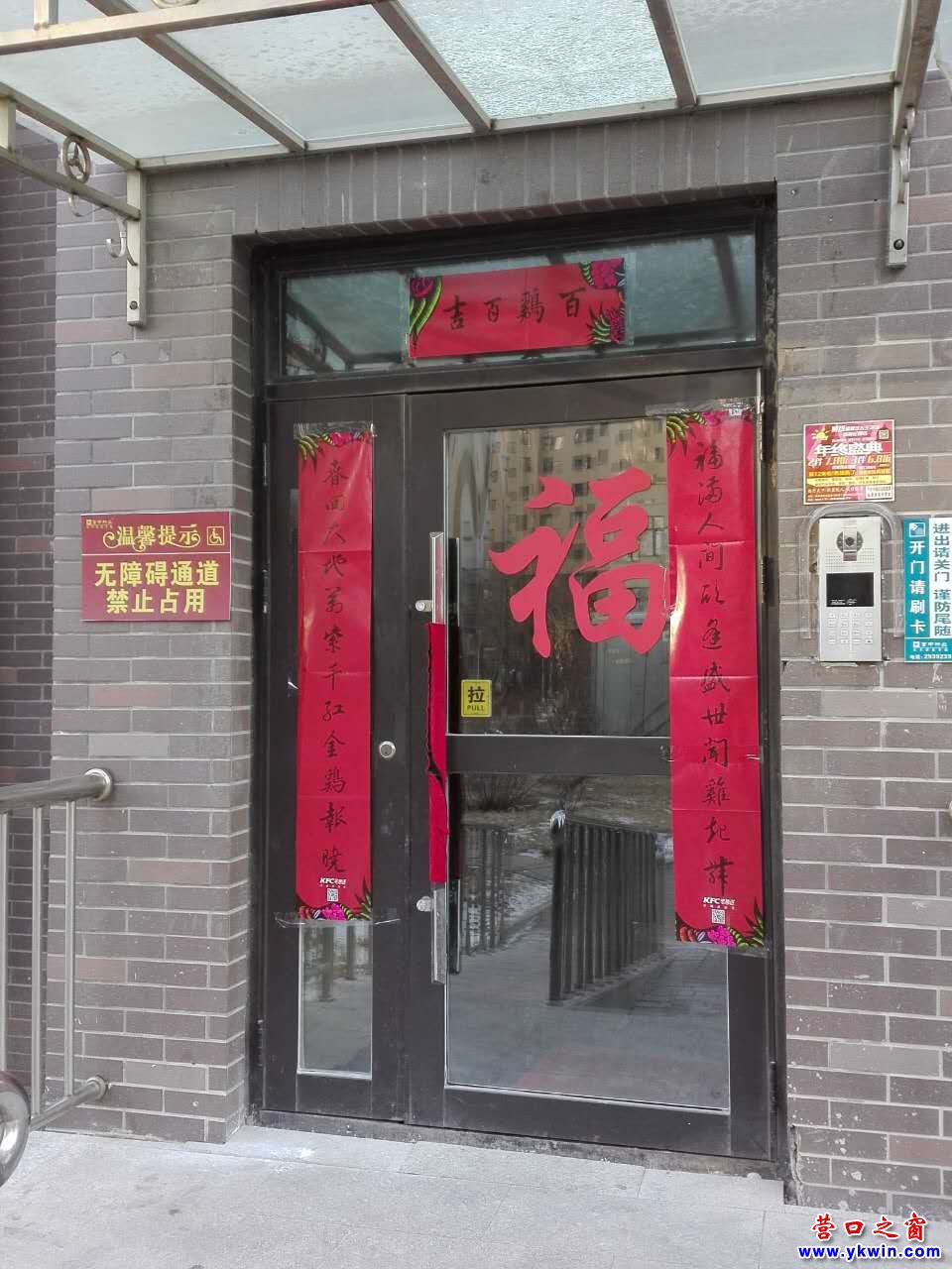 (圖為富甲天下小區(qū)為單元門貼福字楹聯(lián))