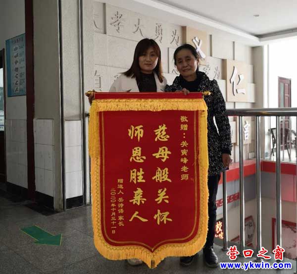 因工作原因,岳詩語同學(xué)的父母無法長期照顧其日常生活。岳詩語說:“平日里,關(guān)寅峰老師十分擔(dān)心我的身心健康。最近天氣寒冷,關(guān)老師看在眼里,急在心上。幾天前,關(guān)老師在百忙之中親自找到我,為我自費(fèi)購買了一件棉襖。”為答謝關(guān)寅峰老師,2020年11月2日,岳詩語家長親自將一面錦旗送到了關(guān)寅峰老師的手中。