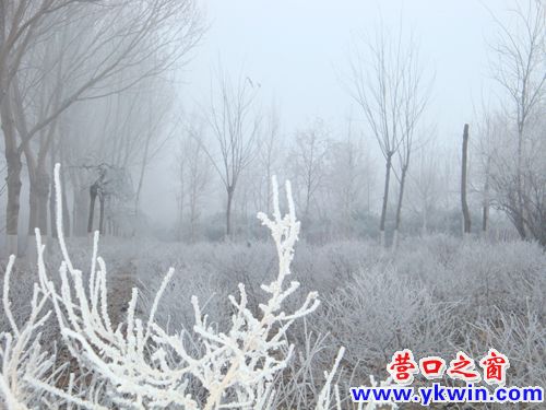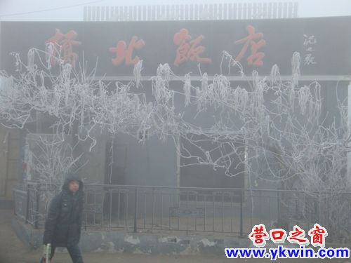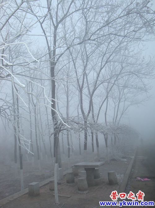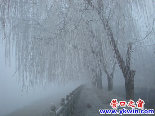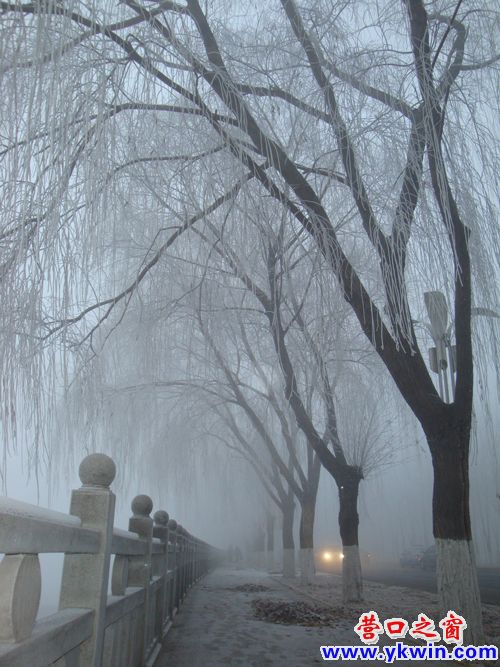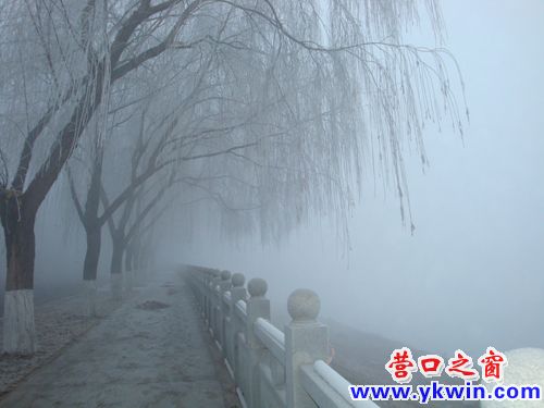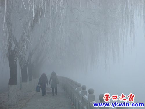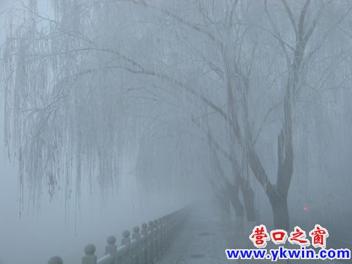 2012年1月13日清晨大霧,蓋州又一次出現(xiàn)霧凇美景。在大清河畔,柳樹上掛滿了樹掛,路上霧氣繚繞,仿佛仙境一般。