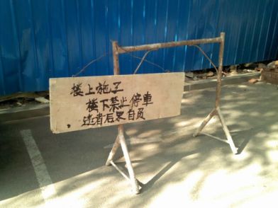 市內(nèi)一處施工工地下方,經(jīng)常掉下一些石子、瓦礫。這里樹立一塊牌子,上面寫著“樓上施工,樓下停車后果自負。”而就在這塊牌子的旁邊一輛轎車赫然停在這里,看來真有不怕挨砸的主,這條道交通擁擠不少堵車中的司機稱,寧可在路上堵一堵,也不走這個險要地帶,既然還有人敢在這里停車真是大跌眼鏡。