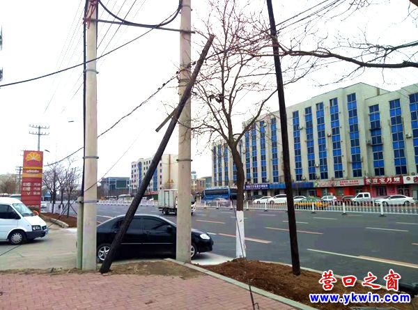 (營口之窗網(wǎng)訊 胡 然)日前,逛營口市金牛山大街。在客運站斜對面至建豐派出所段發(fā)現(xiàn)兩根通訊線桿傾斜:一根向南倒,另一根朝北歪,再看向南倒的線桿周圍那是一片垃圾,與漂亮的金牛山大街形成強烈的反差。