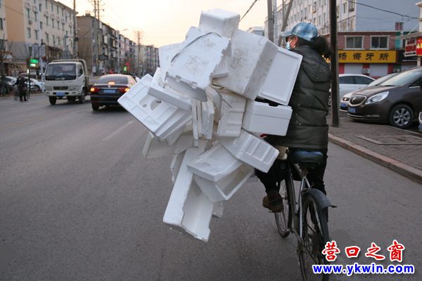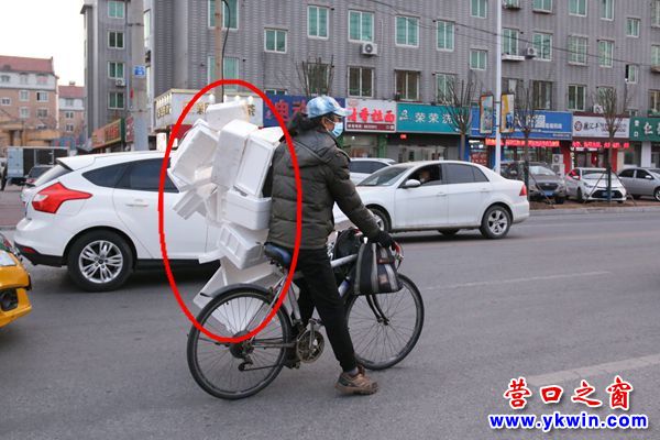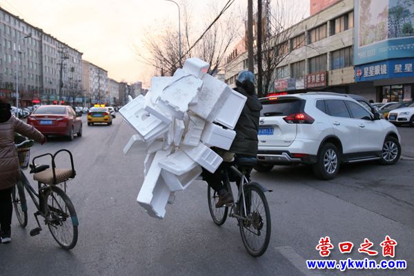 (營口之窗網(wǎng)訊 李凱)昨天傍晚時分,在營口市區(qū)西部,一女子騎自行車左手拎一串廢棄的泡沫箱,搖搖擺擺行進在快車道上,路人都替她捏把汗。