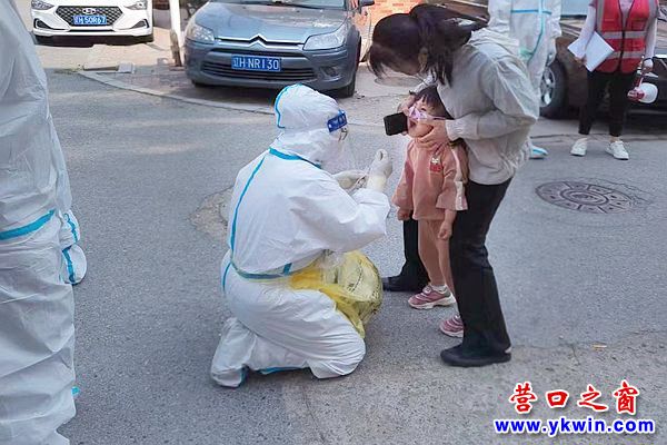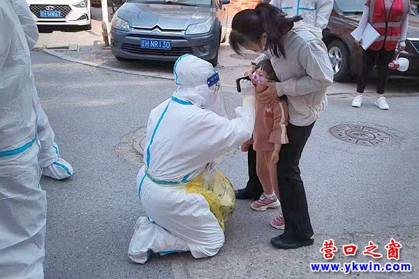 (營口之窗網(wǎng)訊 李凱)5月24日一大早,營口市站前區(qū)躍進(jìn)街道辦事處興躍社區(qū)新興小區(qū),醫(yī)護(hù)人員開始為小區(qū)居民進(jìn)行第十一輪核酸檢測,為了方便給一名孩子做核酸,“大白” 單膝跪地為小朋友做核酸采樣,市民用手機(jī)拍下了這暖心的一幕。