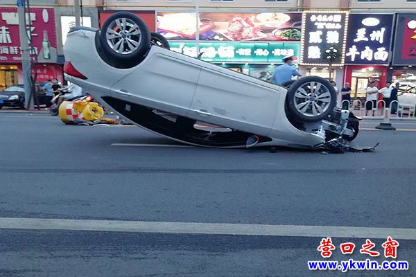 營口:一轎車“四輪朝天”躺在路中間
