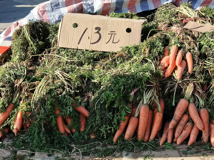 另據(jù)觀察,10月31日,這個大菜市上同一堆胡蘿卜已從10月20日的一元一斤漲到了一元三毛一斤。好在這個大菜市上的蘿卜和大蔥幾乎沒漲。