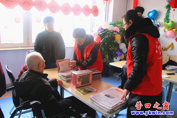在第55個“雷鋒紀(jì)念日”來臨之際,,濱海辦事處鑫海社區(qū)“愛之旅”學(xué)雷鋒公益服務(wù)隊的志愿者們與社區(qū)工作者一起來到了營口市養(yǎng)老服務(wù)中心,看望那里的孤寡老人,為他們送去各種圖書和雜志,豐富了老人們的業(yè)余文化生活并使老人們深切感受到來自社會的“孝心”。