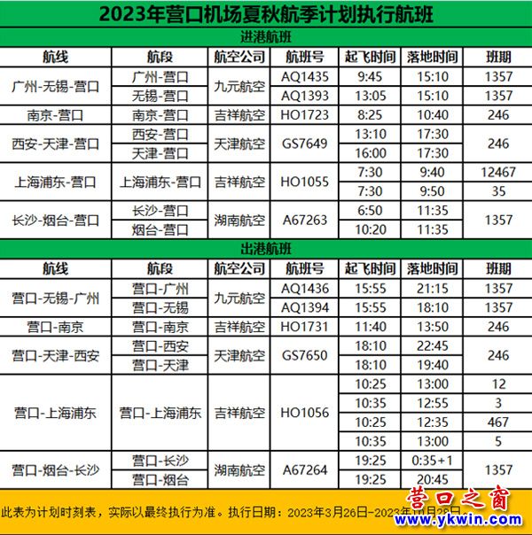(營口之窗“專題報道”)重要更新 | 營口機(jī)場2023年夏秋航季航線航班計劃時刻表