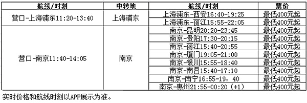 營口出發(fā),經上海浦東、南京祿口機場,中轉航線現已全新上線。多條中轉航線價格僅為400元,行李直掛旅途無憂。