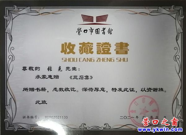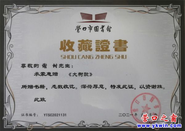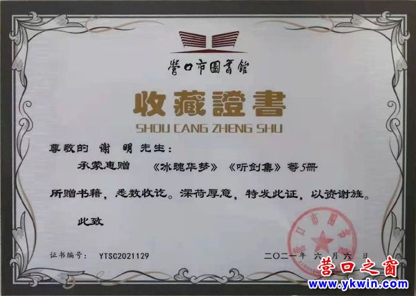 6月21日上午,原營口市作協(xié)副主席、營口鹽業(yè)集團董事長謝星先生為紀念建黨百年向營口市圖書館捐贈了自家四位作者的十部書。圖書館領導高度重視,熱情接待,并當場為謝先生頒發(fā)了<收藏證書>四位作者的十部文集被營口圖書館永久收藏。