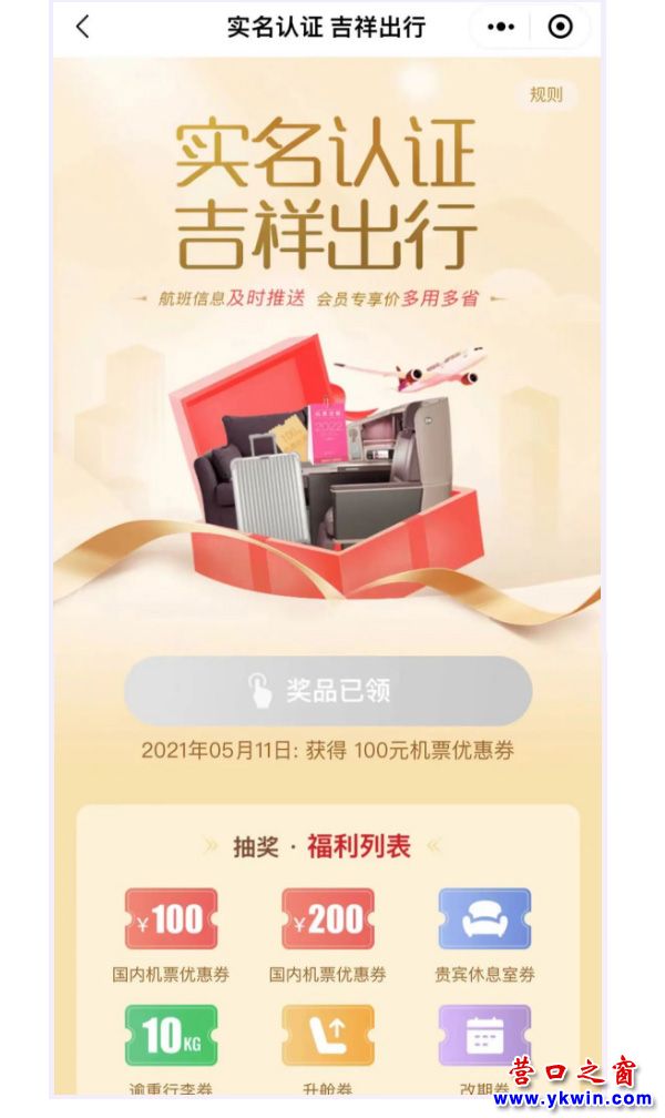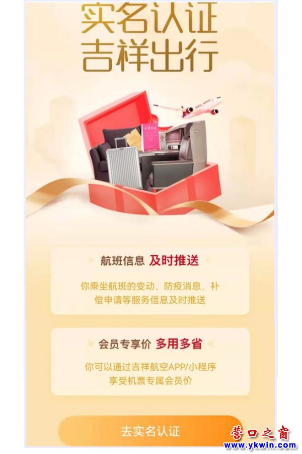 首次實(shí)名認(rèn)證吉祥航空會(huì)員,購(gòu)買吉祥航空承運(yùn)的營(yíng)口=上海浦東或營(yíng)口=南京機(jī)票的小伙伴們,來(lái)領(lǐng)福利了~