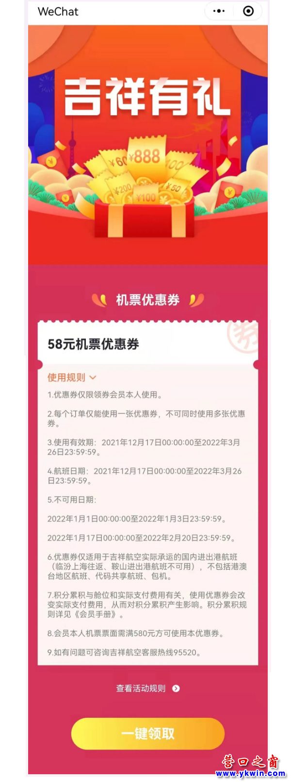 第二波獎(jiǎng)品:面值58元吉祥航空滿減機(jī)票優(yōu)惠券一張(數(shù)量有限,先到先得)