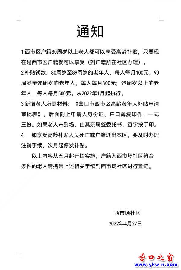 (營(yíng)口之窗“關(guān)注營(yíng)口”)今日,來(lái)自營(yíng)口市社區(qū)消息:西市區(qū)戶(hù)籍80歲以上老人可以享受高齡補(bǔ)貼。最高每人每月500元。從2022年1月起執(zhí)行。