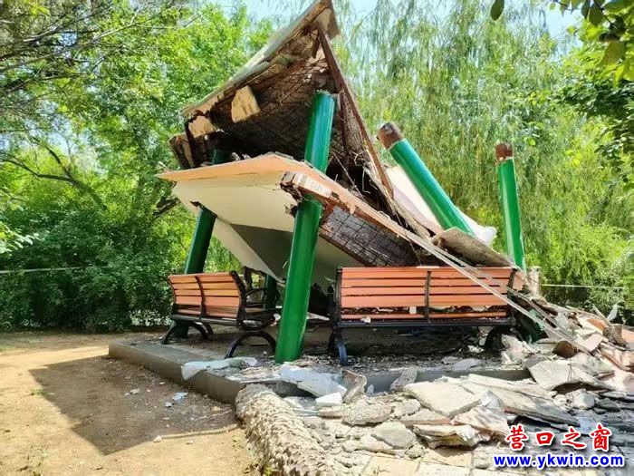 6月13日上午,營口之窗報(bào)道了營口市人民公園一涼亭塌落的消息。當(dāng)天下午,營口市公共設(shè)施維護(hù)集團(tuán)就派出四五十人、八九輛車前來拆除這個(gè)涼亭的殘骸。