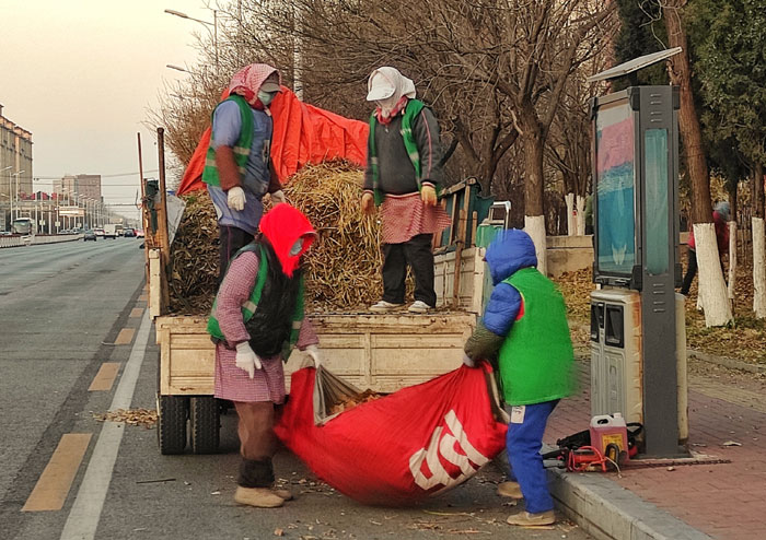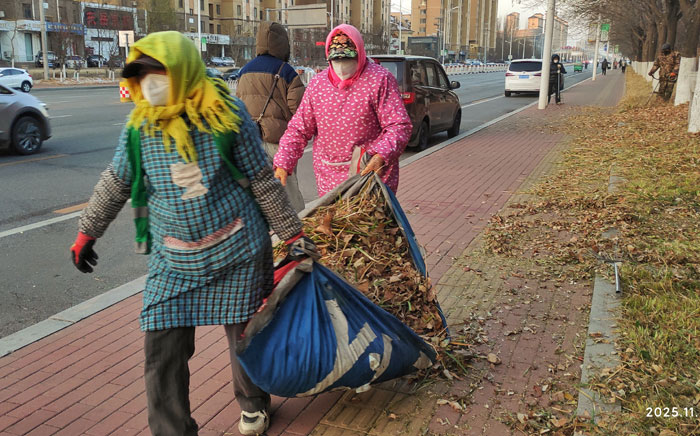 11月26日清晨,營口市青花大街南湖段一群綠化養(yǎng)護(hù)工人冒著寒風(fēng)在街道旁綠化帶草地上忙碌著。她們用鈀子將枯黃的落葉聚攏,放入大片布兜著,然后兩人合作兜著落葉,堆放到綠化養(yǎng)護(hù)卡車上。男養(yǎng)護(hù)工則手持工具在梳理草坪。他們的身影在晨光里,為初冬的綠化帶維護(hù)著整潔,用雙手在落葉與泥土間,書寫著城市綠化的日常堅(jiān)守,在寒風(fēng)中書寫著屬于勞動者的責(zé)任與擔(dān)當(dāng),是這座城市冬日里最溫暖的風(fēng)景。