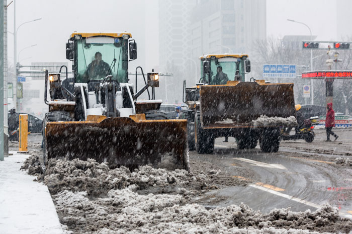 天剛蒙蒙亮,城市還在沉睡,營口環(huán)衛(wèi)工人的身影就已經(jīng)出現(xiàn)在街頭巷尾。橘紅色的工作服在一片雪白中格外醒目,鏟車將路面的積雪推到兩側(cè),然后裝到斗車?yán)?,運(yùn)出市外,清雪車轟隆作響,沿著干道緩緩前行,,露出干凈整潔的柏油路面,小型鏟雪車則穿梭在背街小巷,靈活地清理著犄角旮旯的積雪。