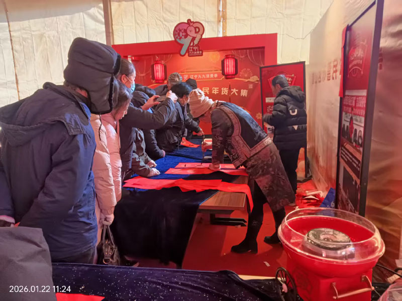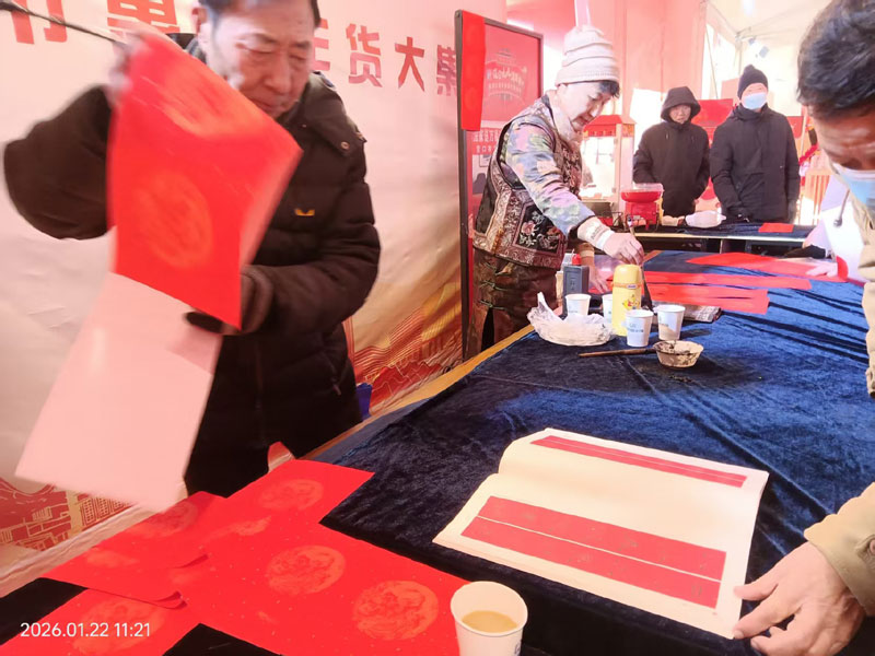 元月21日至23日,營口市西市區(qū)惠民年貨大集在西市迎春市場隆重舉行。市場里貨品充足,顧客盈門,人們從四面八方涌來,熱鬧非凡,我是在集市開幕的第二天來到那里的,雖然沒有看到開幕式,但是,這里的氣氛依然是年味濃濃,主打一個(gè)紅字。有紅招牌,紅舞臺,掛紅燈籠,紅福字,紅掛件,外加紅對聯(lián)。何止有現(xiàn)成的對子,而且我還看到,有好幾個(gè)書法家現(xiàn)揮筆潑墨,免費(fèi)給前來的顧客書寫春聯(lián),更加顯示了文化和經(jīng)濟(jì)同臺唱戲,春節(jié)未到,這里面已經(jīng)喜氣洋洋。