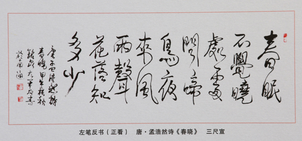 “我的書法追求一直是建立在傳統(tǒng)根基之上的,而且面灑得比較廣,經(jīng)常變化,有時(shí)候是隨性情而作。我個人主張不囿哪家某派,吸古納今,兼學(xué)并用。我注重繼承傳統(tǒng),在書法上涉足面廣,博涉諸家,納百川為一流,求索創(chuàng)新,把中國畫的技法和雙筆書法、雙筆絕活融為一體,在筆情墨趣中追求己意。”