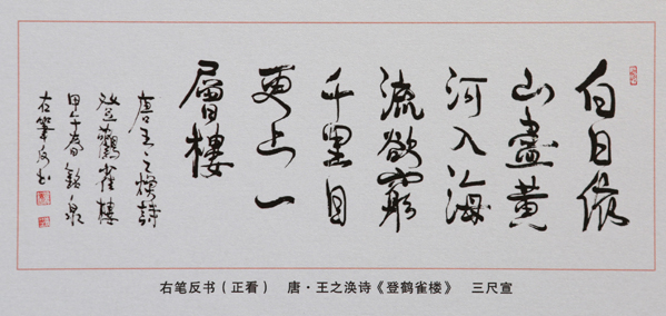 思維活躍的褚銘泉10歲起偷偷開始左手練字,筆耕不輟,就是在文化大革命期間,練習(xí)也未停止。天地就是他的紙和板,草棍和樹枝、石子都是他的筆。50年來,他練就了左右筆的正、反、倒、倒反八個方位的雙筆奇書書法。