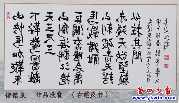 9月恰逢國際經(jīng)貿(mào)洽談會在營口召開。會議召開前夕,營口市文化局局長李德泰順應(yīng)群眾呼聲,主持了一個以喜迎洽談會為主題的雙筆書法表演活動,活動地點(diǎn)設(shè)在第二建筑公司的會議室,時(shí)任市委宣傳部副部長的田華參加,電視臺、日報(bào)社、電臺記者紛紛報(bào)道了這次活動。1993年11月15日,褚銘泉應(yīng)邀赴北京參加第一次中國書畫代表會,途徑沈陽換車,住宿在紅星賓館。《遼寧經(jīng)濟(jì)》雜志總編呂鐵生得知褚銘泉來沈,邀請遼寧電視臺的記者帶著筆墨和宣紙趕到賓館,現(xiàn)場請褚銘泉展示雙筆書法技藝。