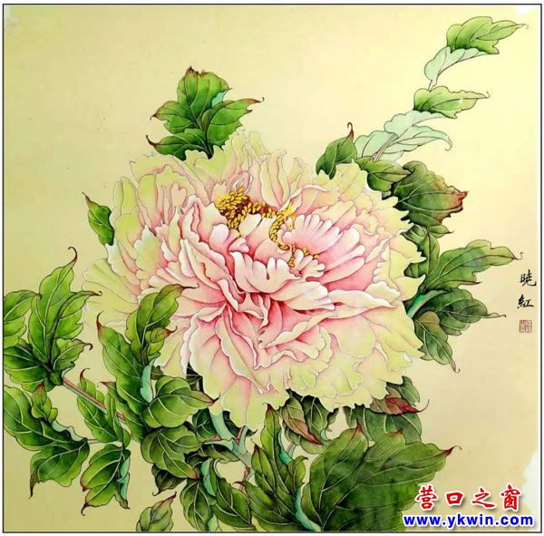 “唯有牡丹真國色,花開時節(jié)動京城”,流傳千余年唐代大詩人劉禹錫的《賞牡丹》,至今仍膾炙人口,而曉紅老師筆下的工筆國畫《牡丹》,一枝獨秀,雍容華貴。靜態(tài)不失動感的綠葉,每一片都各有展姿,舒放的,卷曲的,陽光面的,側(cè)陰處的,葉掌的深綠過度至葉尖的淺白,清晰的葉脈,伸展著…若相互約定,努力著,共同烘托掌上的花魁!碩大的花瓣,幾點淡黃色的花蕊,由深擴(kuò)散逐漸變淺的粉紅色,十分低調(diào)地告訴觀者,她是古老的“酒醉楊妃”,即便是當(dāng)代,也是牡丹珍品中的前三!國色天香,珍貴奢華,風(fēng)情盡顯,精工天成,躍然紙上!