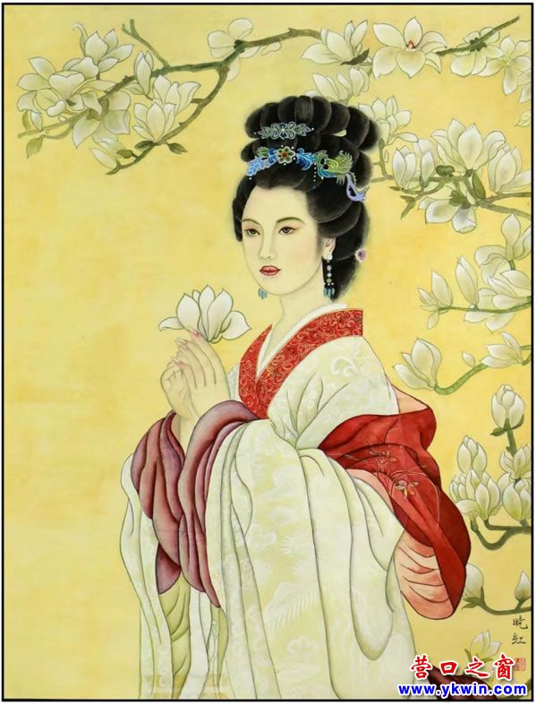 《蘭貴飄香》,一幅很抓眼球的“仕女圖”!不做“效顰”之態(tài),無“落雁”之惆悵,不追“閉月”之意境,不仿“羞花”之容顏!未擬西施的尖頜,不襲昭君的消瘦,未取貂蟬的媚眼,不討巧貴妃的環(huán)肥!圖中的仕女,發(fā)髻高挽,翡翠相間,頭釵橫貫,玉墜垂耳,略施粉黛,鳳眼凝視,鼻翼挺翹,朱唇小口,圓潤下頜,修長頸項,玉指執(zhí)花,身著米黃錦緞,飄逸懸垂,醬紅披肩,相宜圍領(lǐng),紫紗內(nèi)襯,環(huán)花而佇,是人在嗅花香,還是花在贊人美?毋庸置疑,這是曉紅老師筆下,不抄襲,不雷同,是由心底合盤托出的一幅獨創(chuàng)的大美仕女圖!