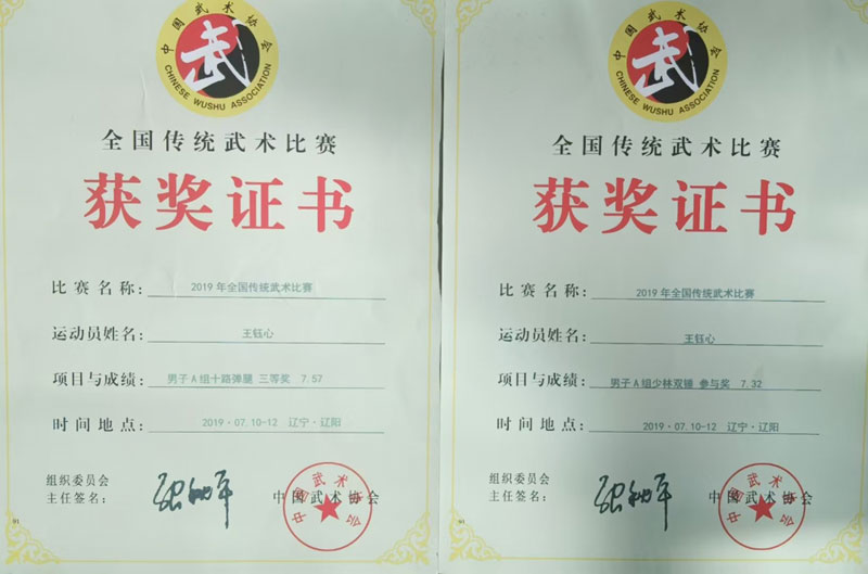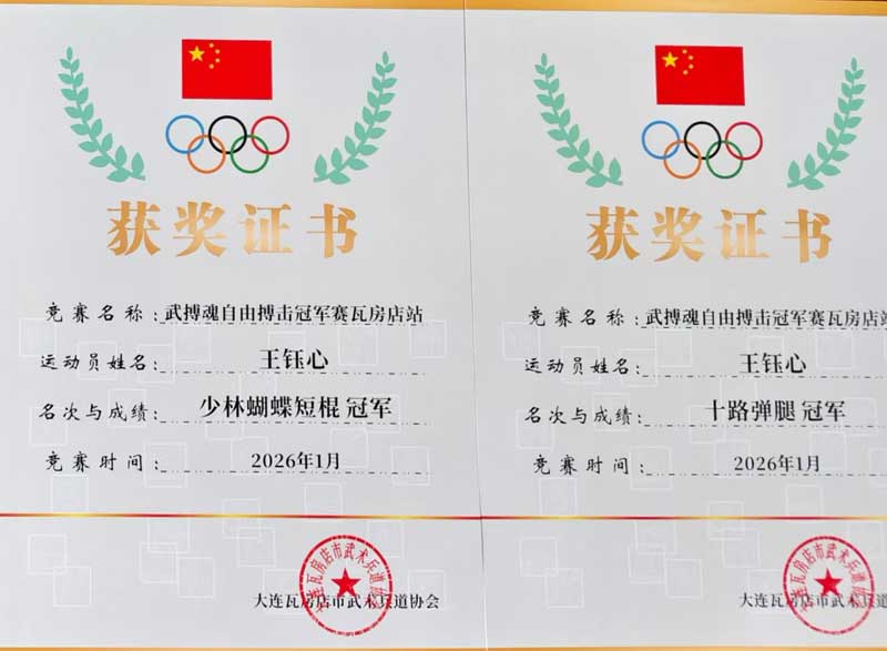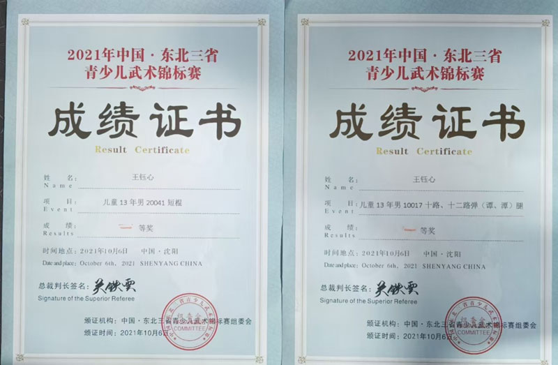 6歲時,他首次參加全國武術大賽,便拿下拳術三等獎;8歲征戰(zhàn)遼寧省武術比賽,一舉奪得拳術、短棍雙項金牌;10歲再獲省賽拳術一等獎、雙錘三等獎;11歲依舊穩(wěn)扎穩(wěn)打,斬獲省賽拳術二等獎、短棍三等獎。一塊塊獎牌、一本本證書,都是對他勤學苦練的最好見證,賽場上的他自信果敢、力量十足,盡顯少年武者的鋒芒。